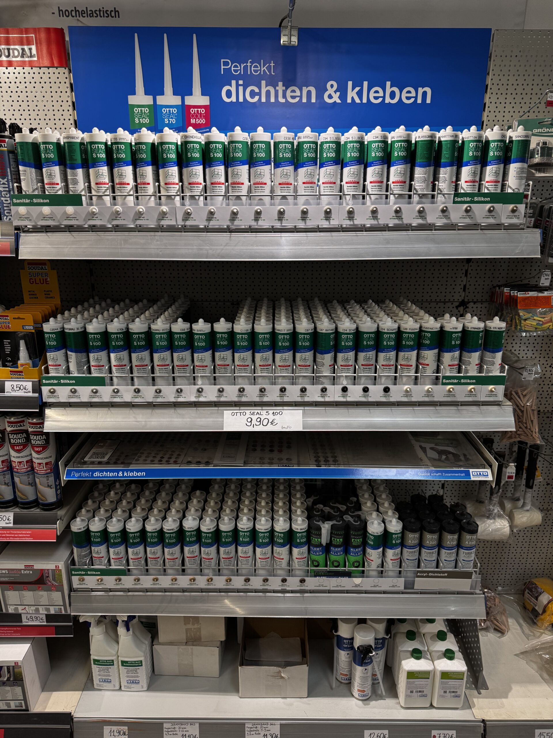 Wand- und Bodenfliesen in allen Formaten (30×60, 60×60, 60×120, Feinsteinzeug, Metrofliesen), Fliesenkleber C2TE S1, Flexkleber für Großformate, Nivelliermassen, Fugenmörtel in 20 Farben, Silikone, Abdichtungssets (Dichtbänder, Innenecken, Manschetten), Fliesenschneider, Diamanttrennscheiben, Schwämme, Wascheimer und Kreuze/Nivelliersysteme – alles sofort auf Lager.