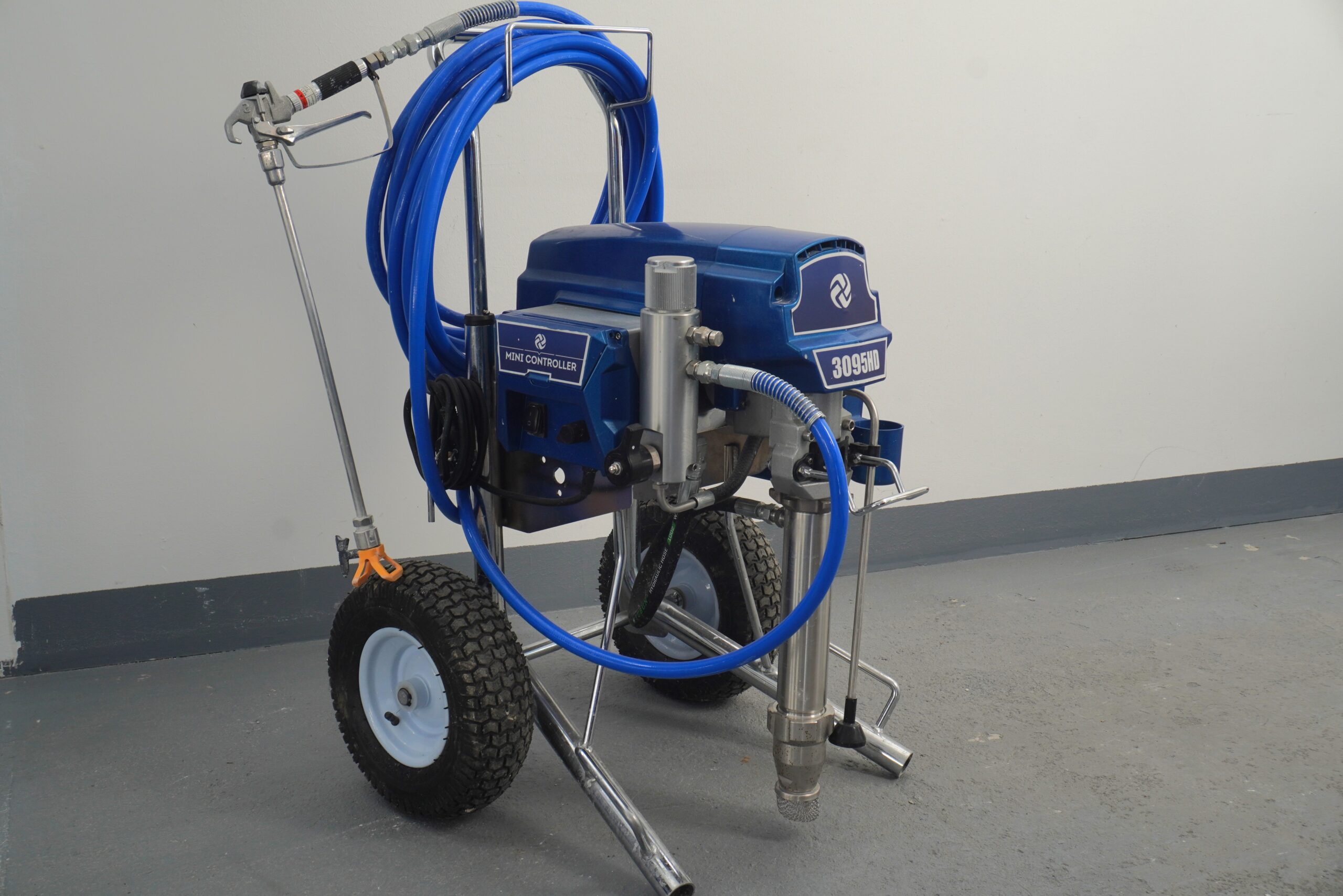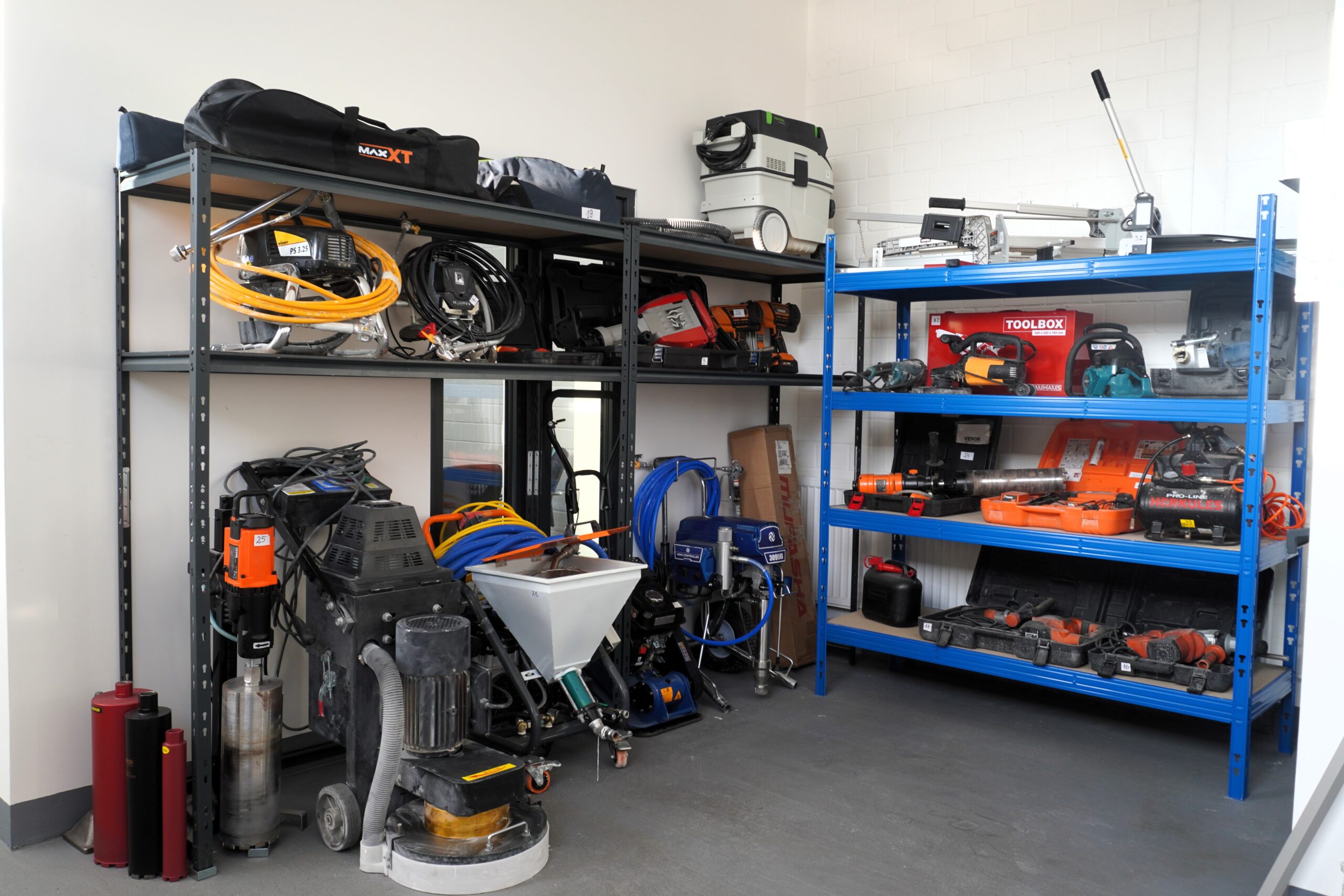 Hier steht alles bereit: Langhalsschleifer mit LED-Licht und Absaugung, Plattenheber, Trockenbaufräsen, Stützböcke, Verlängerungskabel, Schleifgitter in jeder Körnung und das passende Mischpaddel – frisch gewartet, geprüft und sofort mitnehmbar.